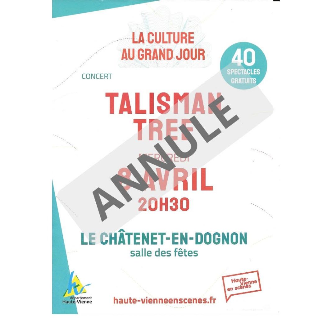 Nous vous informons avec regrets que pour des raisons médicales, le groupe Talisman Tree se voit dans l’obligation d’annuler son concert prévu ce mercredi 8 avril au Châtenet-en-Dognon dans le cadre de la culture au grand jour. Nous nous excusons pour le désagrément et vous remercions pour votre compréhension. Nous espérons vous retrouver trés bientôt lors d’un prochain évenement culturel sur notre commune.