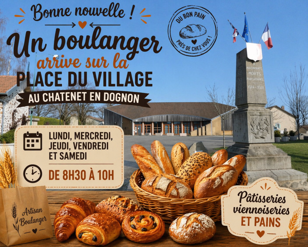 Comme vous le savez notre priorité est l’ouverture prochaine d’un nouveau commerce dans notre commune. En attendant celui-ci nous avons le plaisir de vous informer de la mise en place dès ce lundi 20 avril de la venue d’un boulanger itinérant sur la place du village.
